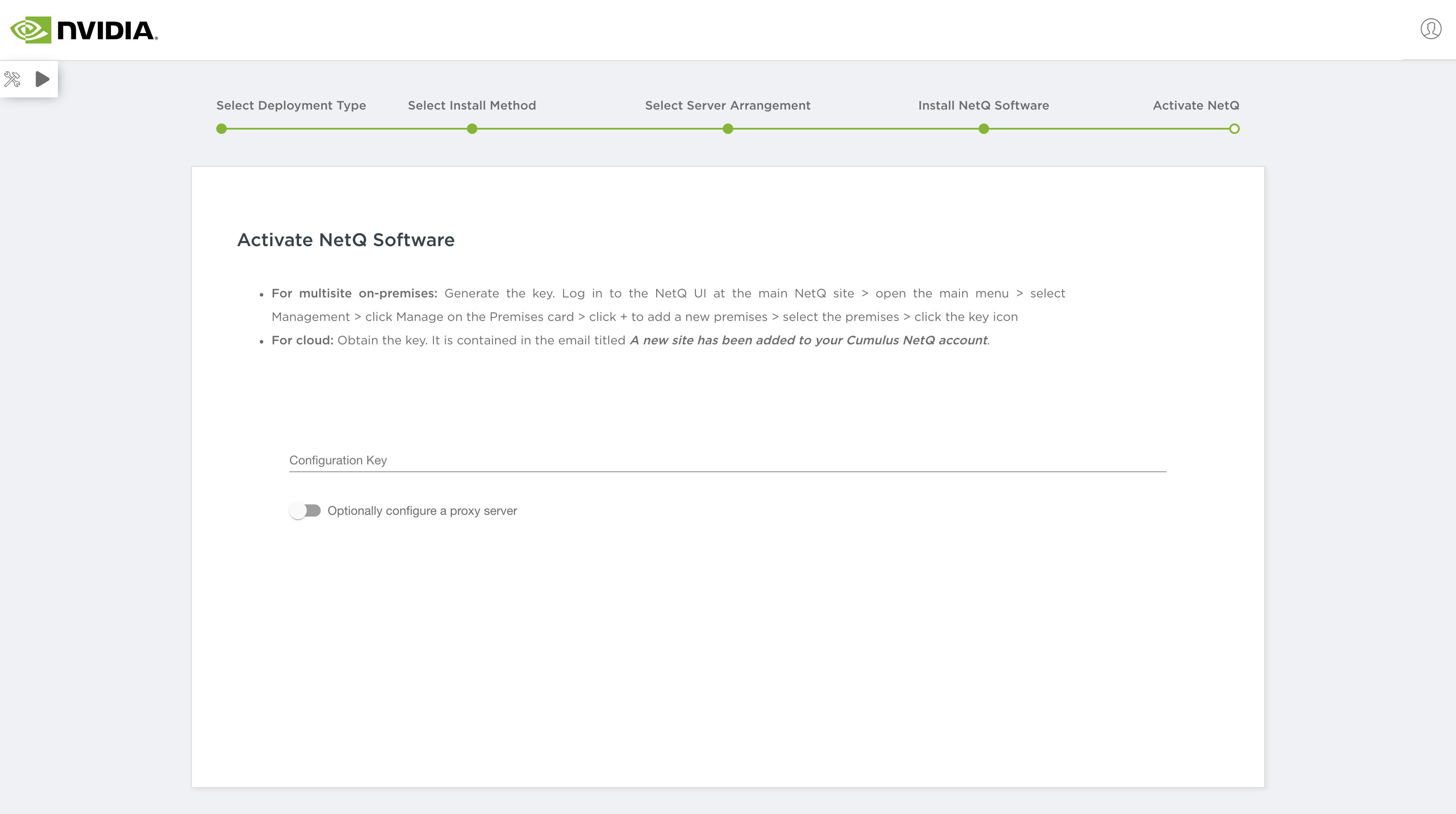 This final step activates the software and enables you to view the health of your NetQ system. For remote deployments, you must enter your configuration key. The configuration key is obtained during first login to the NetQ Cloud and premise activation, and it can also be accessed from the Premise menu.