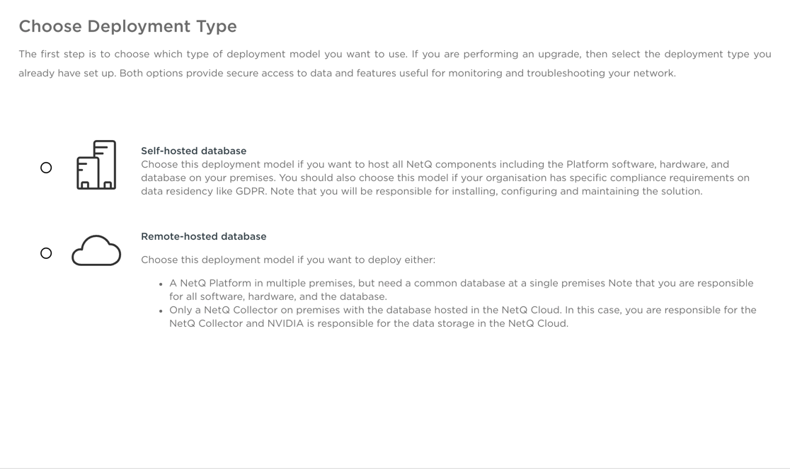 Choose the deployment model you want to use. Both options provide secure access to data and features useful for monitoring and troubleshooting your network.