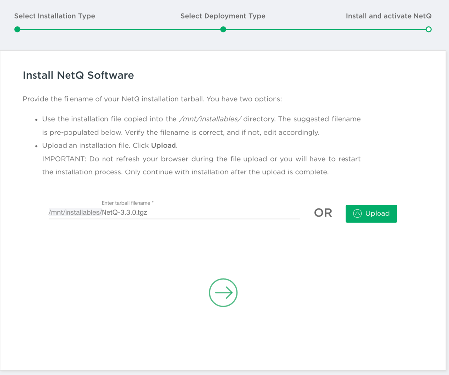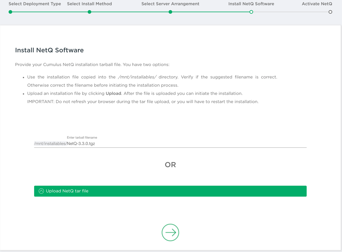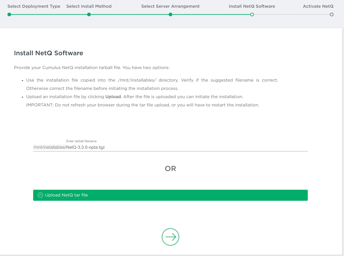 - Enter or upload the NetQ 4.1.0 tarball.