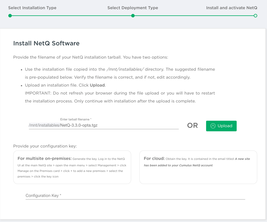 For cloud: Accept the path and filename suggested, or modify these to reflect where you stored your installation file. Enter your configuration key. The configuration key is obtained during first login to the NetQ Cloud and premise activation, and it can also be accessed from the Premise menu. Then click