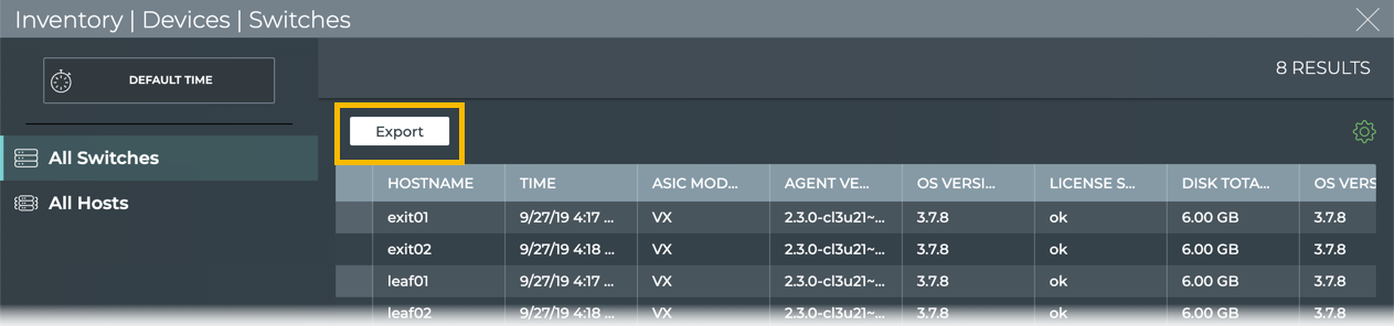 Open the full screen Switch Inventory card, select the data to export, and click Export.