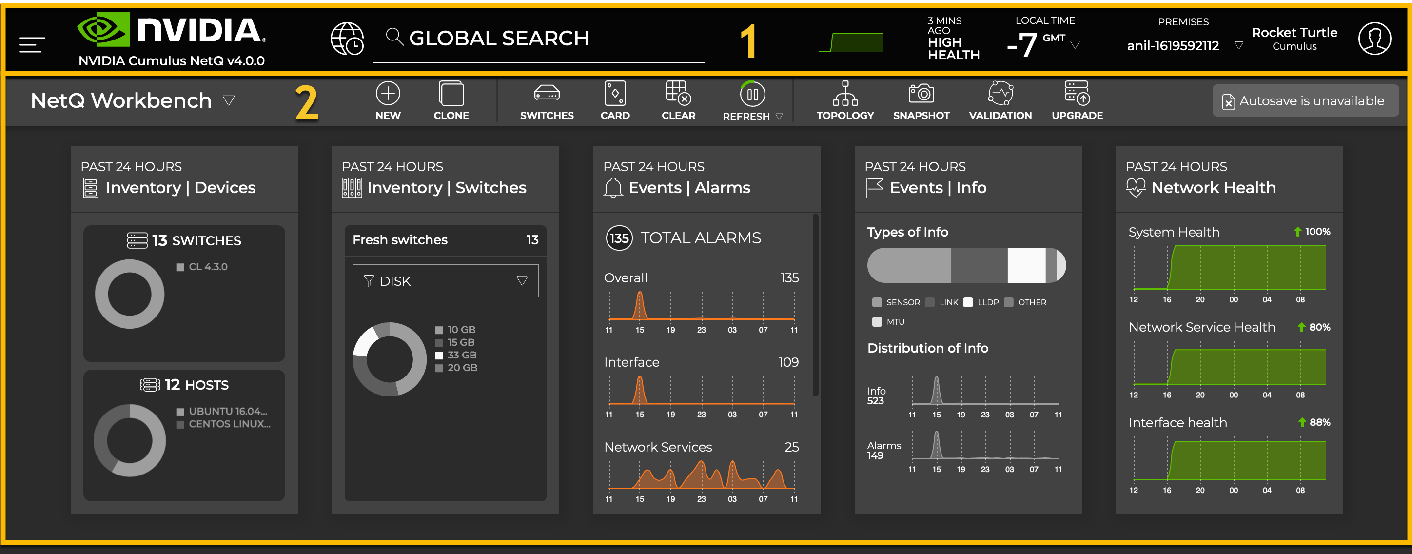 - Application Header (1): Contains the main menu, NetQ version, recent actions history, search capabilities, quick health status chart, local time zone, premises list, and user account information.