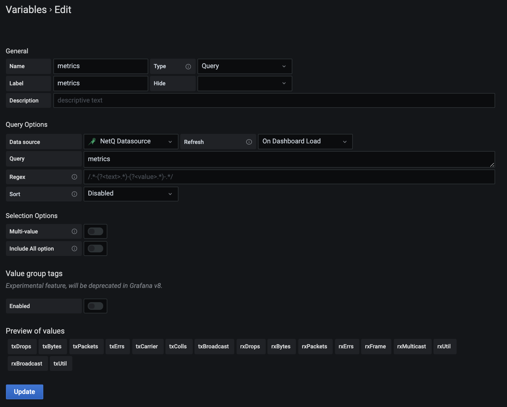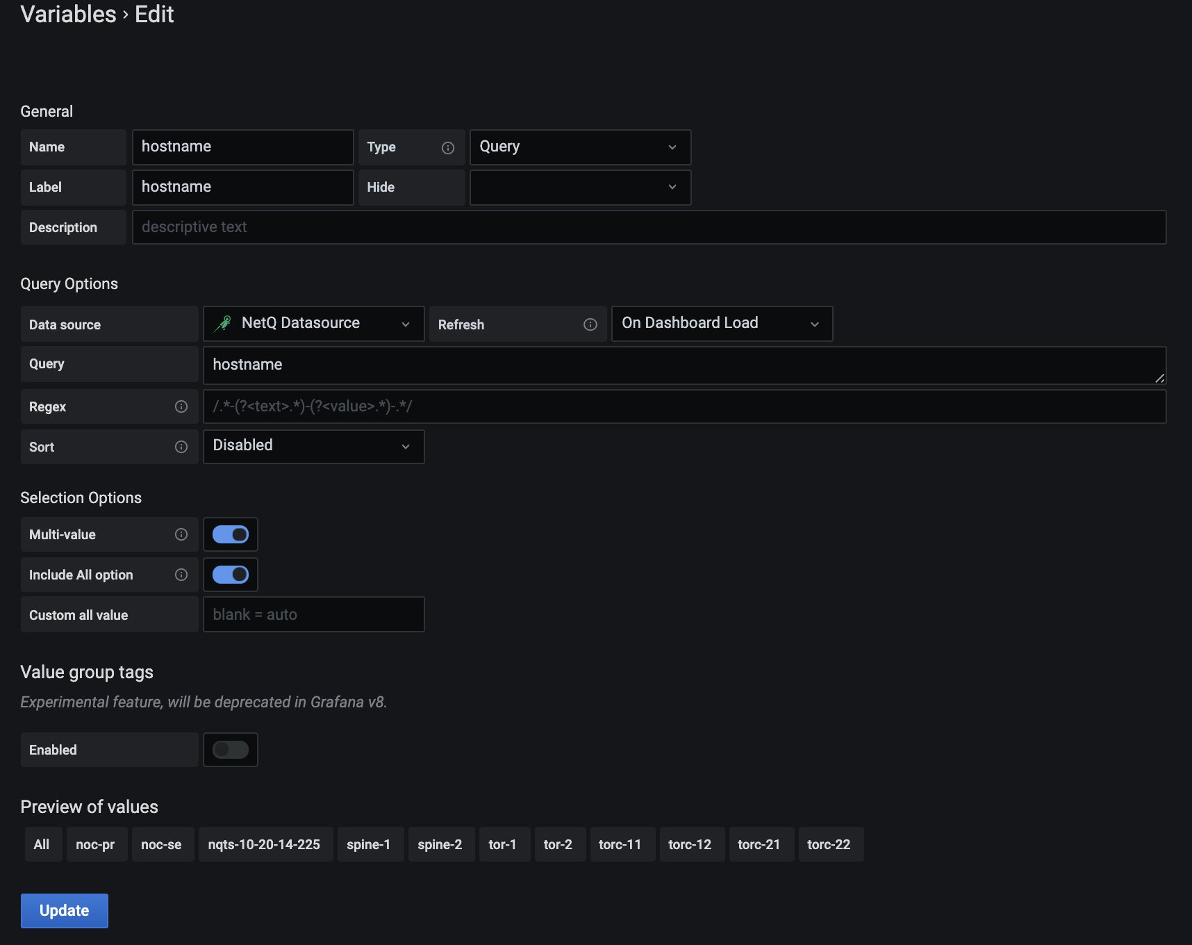 /etc/grafana/grafana.iniand addallow_loading_unsigned_plugins = netq-dashboardto the file.cumulus@switch:~$ sudo nano /etc/grafana/grafana.ini ... allow_loading_unsigned_plugins = netq-dashboard ... -