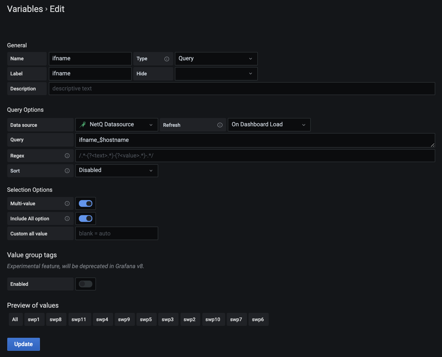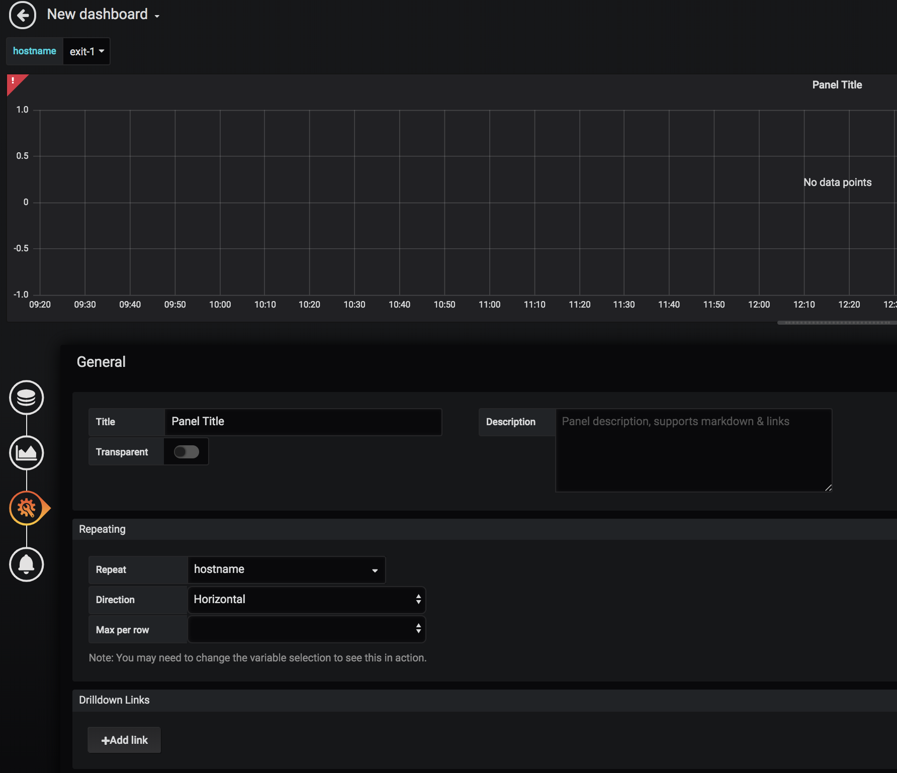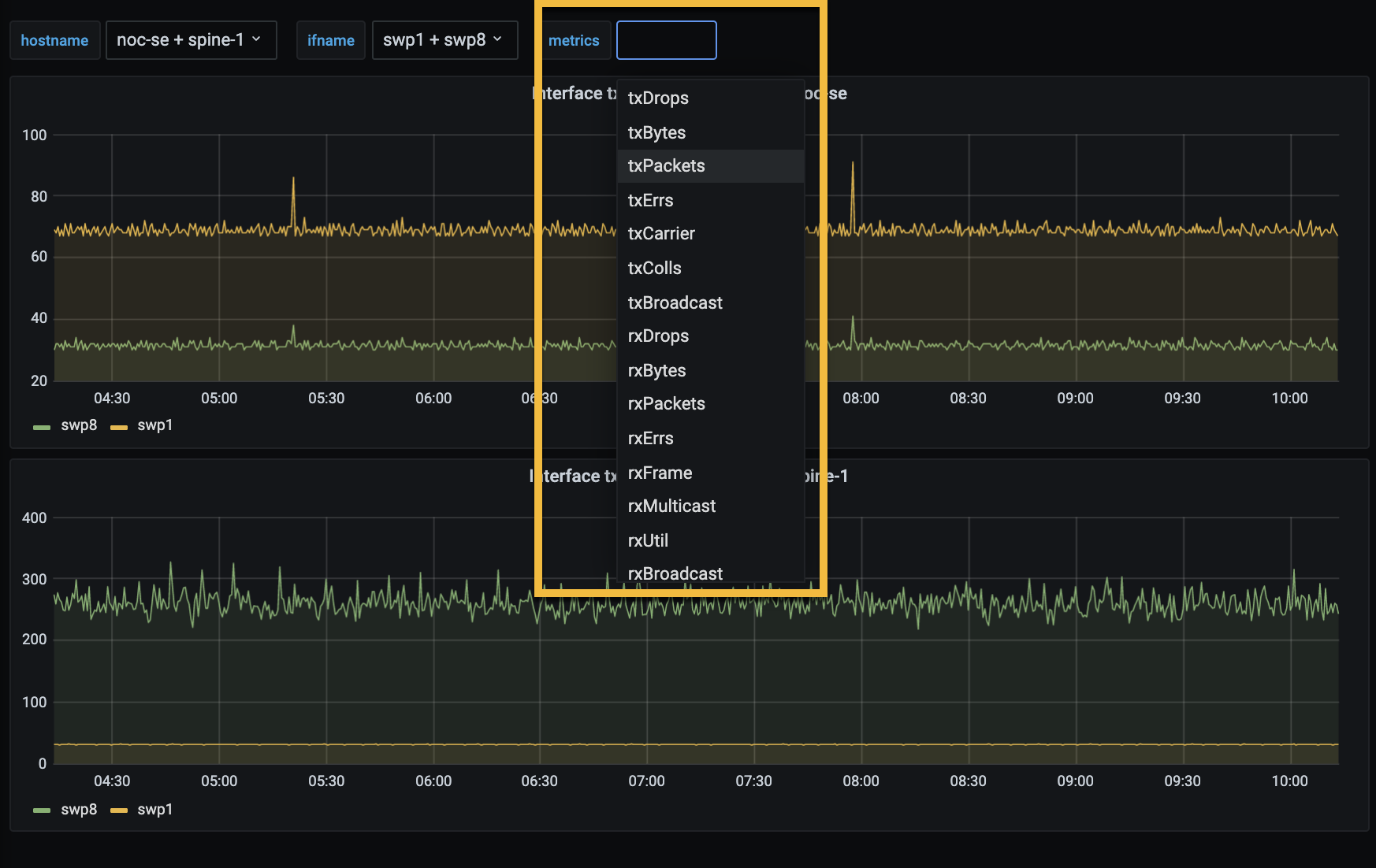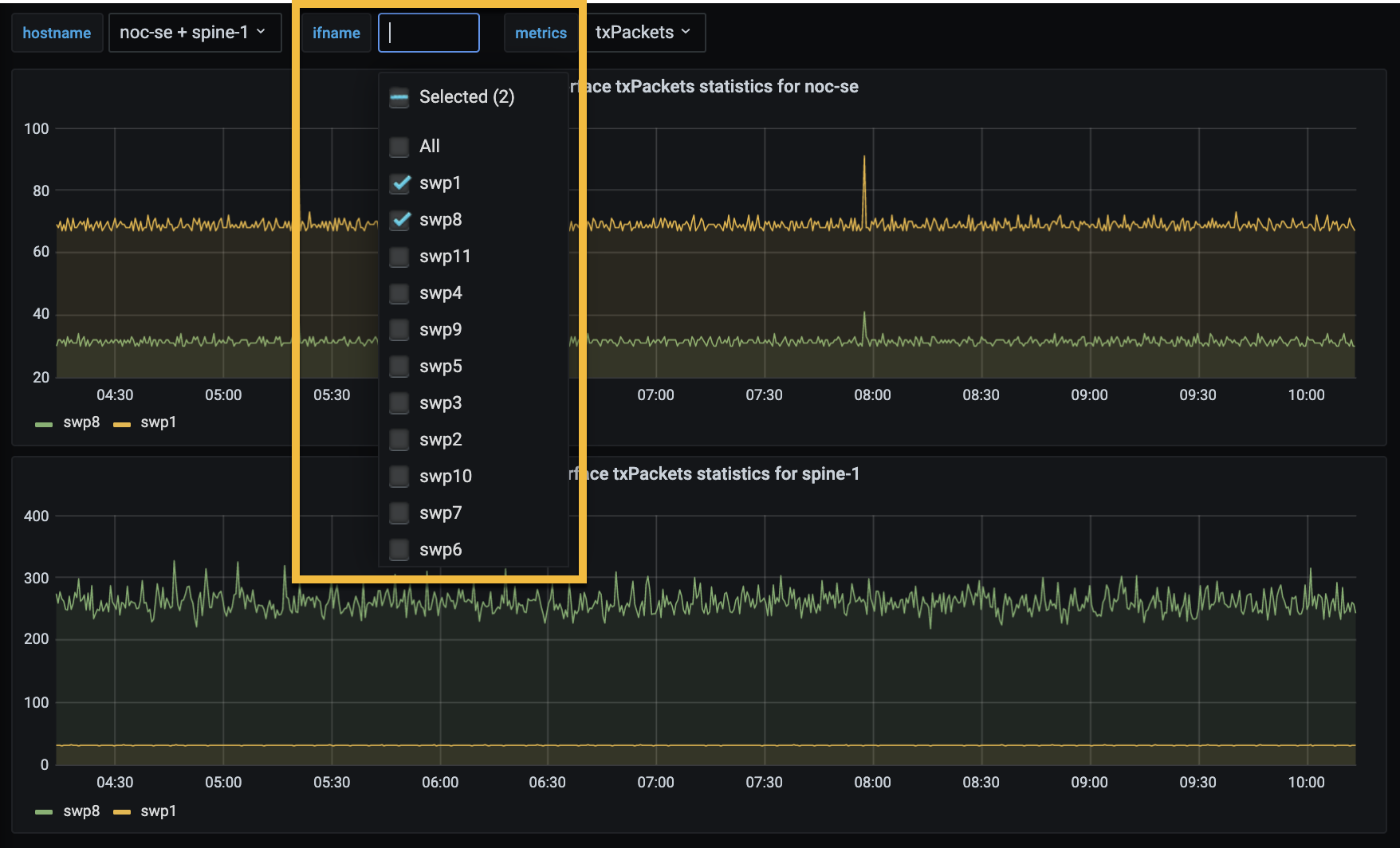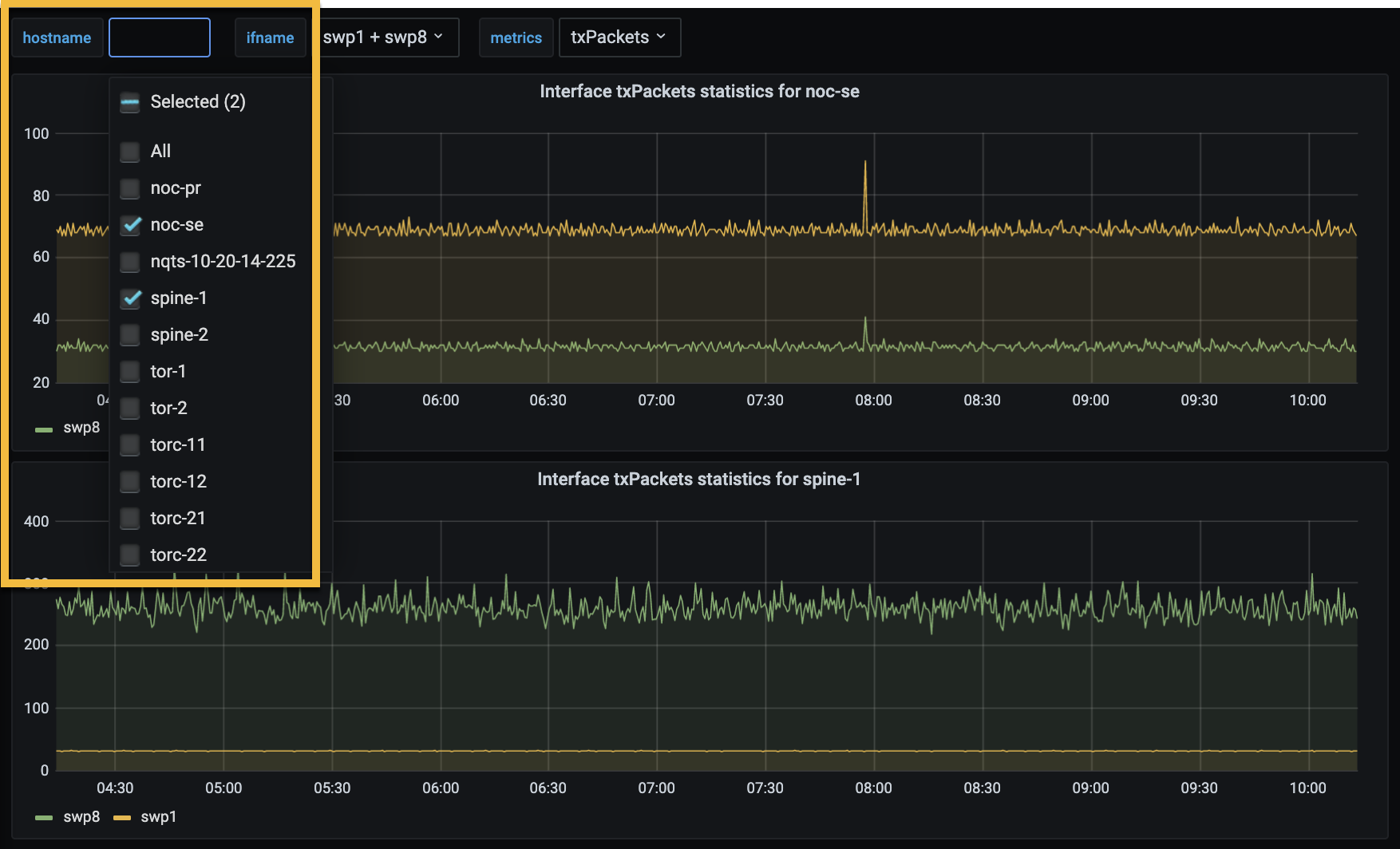 This example shows a dashboard with two hostnames, two interfaces, and one metric selected. The more values you select from the variable options, the more charts appear on your dashboard.