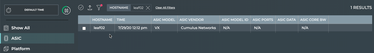This example shows the ASIC information for the NetQ On-premises or Cloud Appliance.