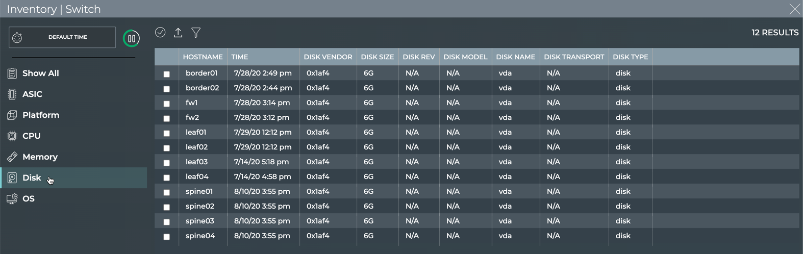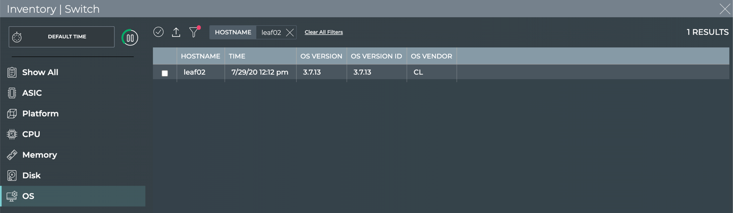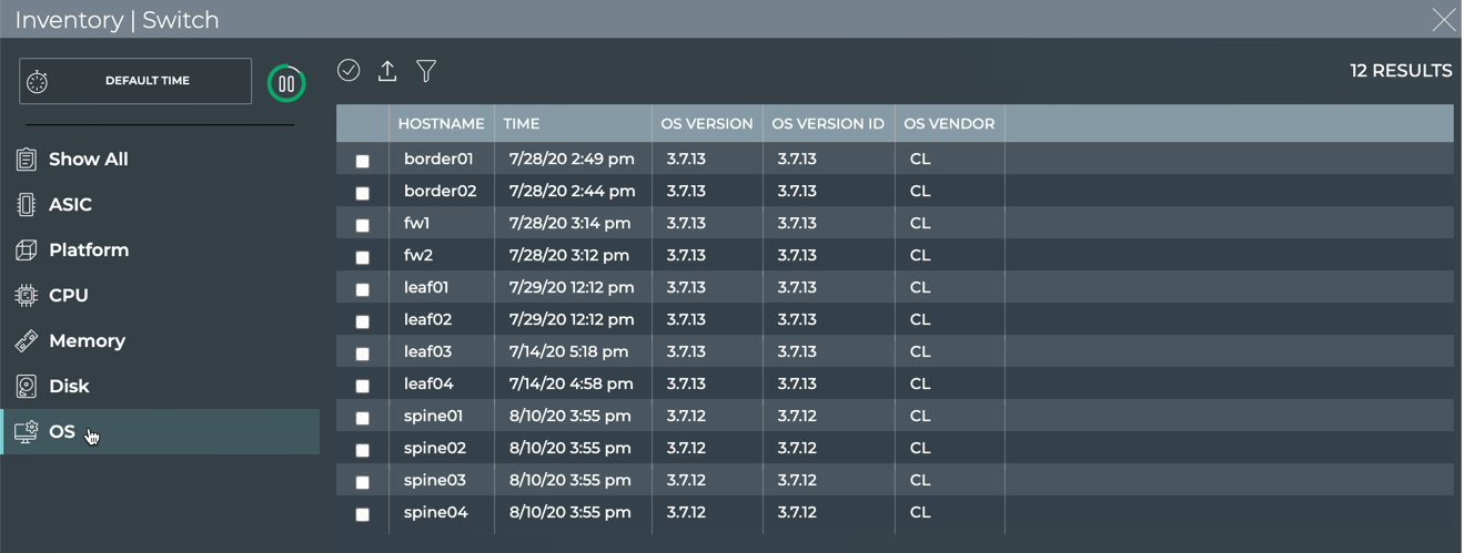 - Medium: view count of OS, ASIC, platform, CPU model, Disk, and memory types or versions across all switches