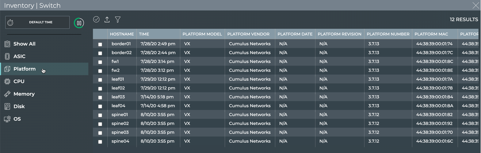 - Full-screen: view platform vendor, model, manufacturing date, revision, serial number, MAC address, series for a switch (table)