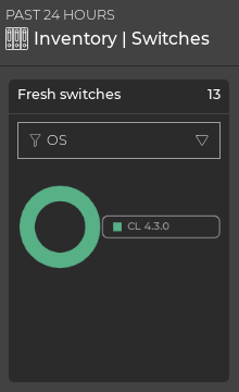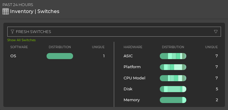 By default, the data is shown for switches with a fresh communication status. You can choose to look at the data for switches in the rotten state instead. For example, if you wanted to see if there was any correlation to a version of OS to the switch having a rotten status, you could select Rotten Switches from the dropdown at the top of the card and see if they all use the same OS (count would be 1). It might not be the cause of the lack of communication, but you get the idea.