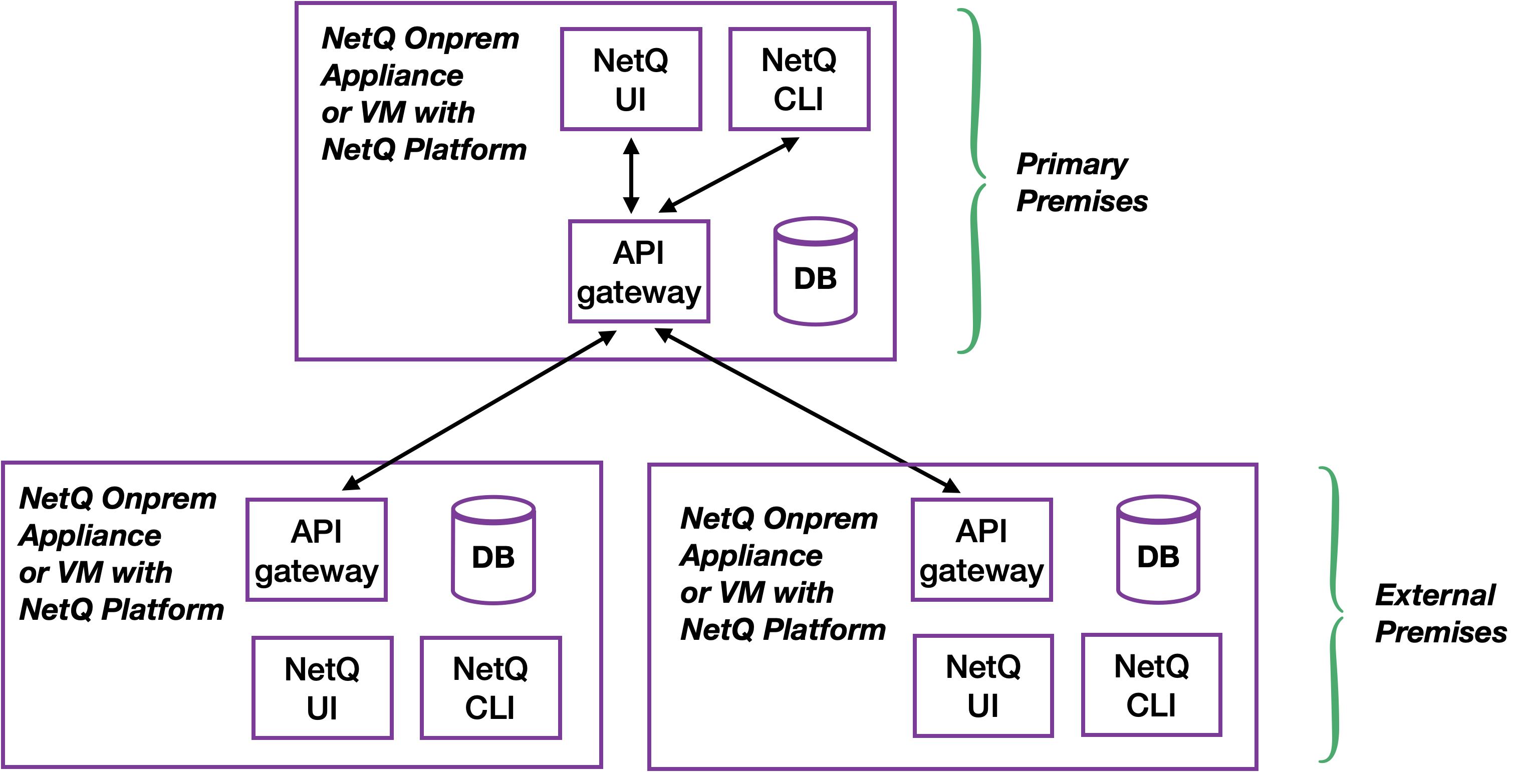 - The NetQ appliance or VM at one of the deployments acts as the primary premises for the premises in the other deployments (similar to a proxy)