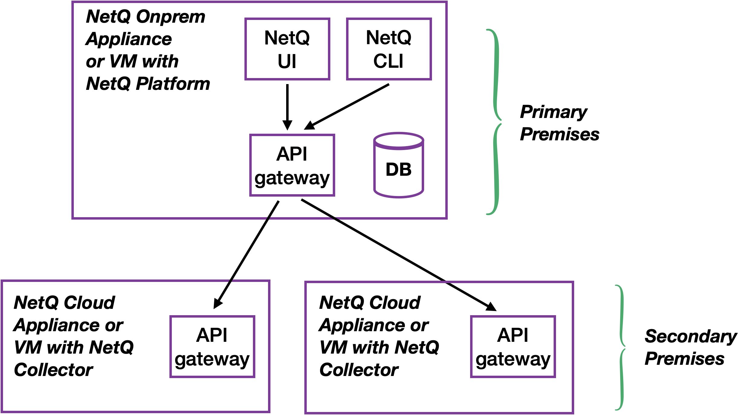 - All other deployments are secondary premises; they run the NetQ Controller software and send their data to the primary premises for storage and processing