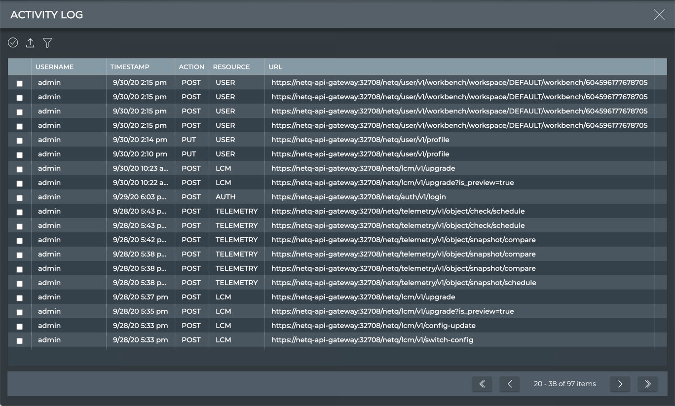 NetQ application administrators can audit user activity in the application using the Activity Log.