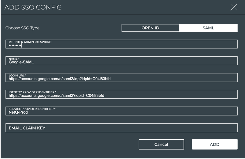 You need several pieces of data from your Microsoft Azure or Google account and authentication server to complete the integration. Open your account for easy cut and paste of this data into the NetQ form.