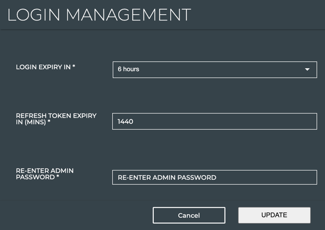 Select how long a user can be logged in before logging in again; 30 minutes, 1, 3, 5, 6, or 8 hours. Default for on-premises deployments is 6 hours. Default for cloud deployments is 30 minutes.