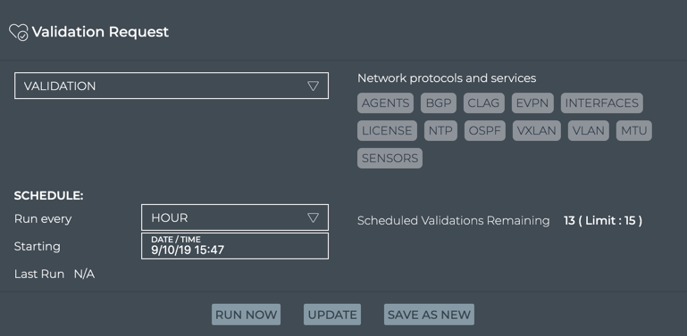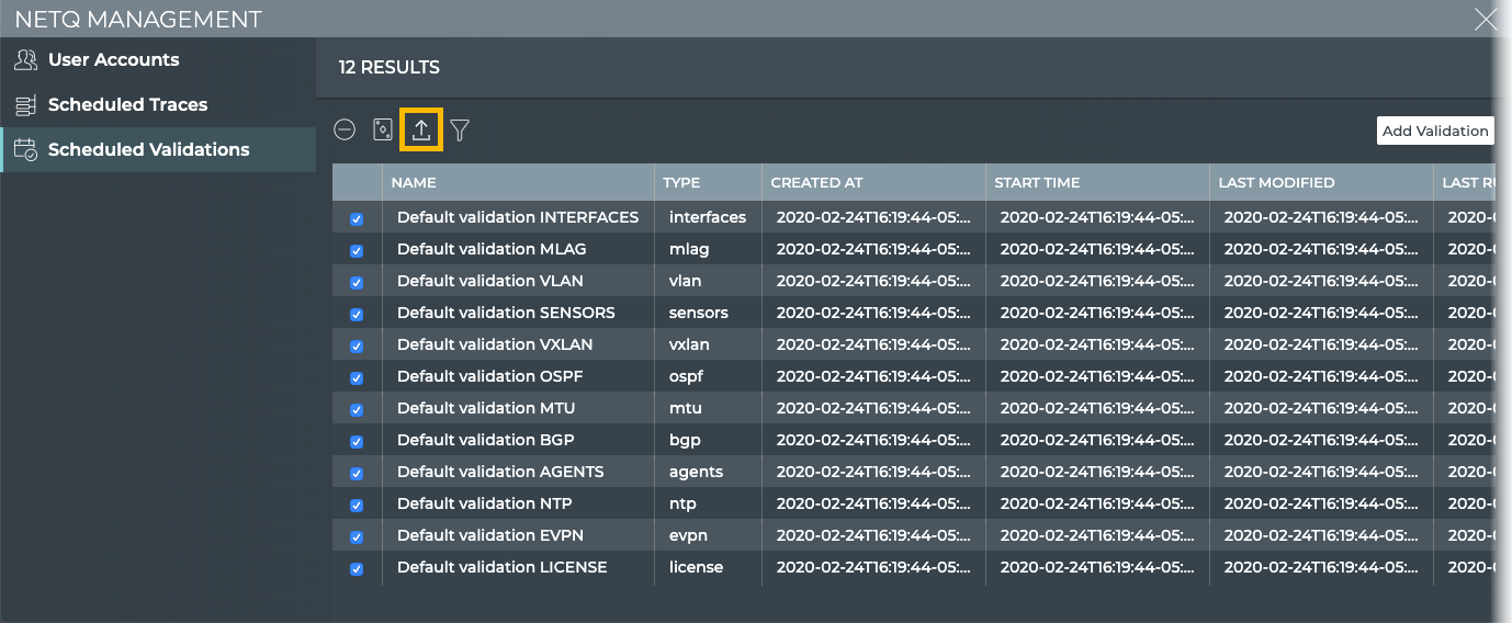 From the NetQ Management workbench, you can view the total number of validations scheduled to run in the system. A set of default scheduled validations are provided and pre-configured with the NetQ UI. These are not included in the total count. As an administrator, you can view and export the configurations for all scheduled validations, or add a new validation.