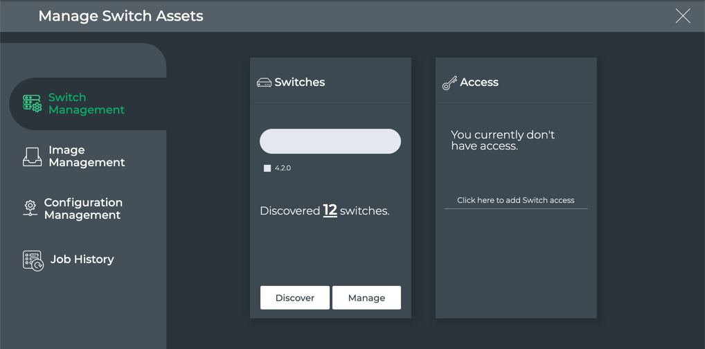 The Manage Switch Assets view provides access to switch management, image management, and configuration management features as well as job history. Each tab provides cards that let the administrator manage the relevant aspect of switch assets.