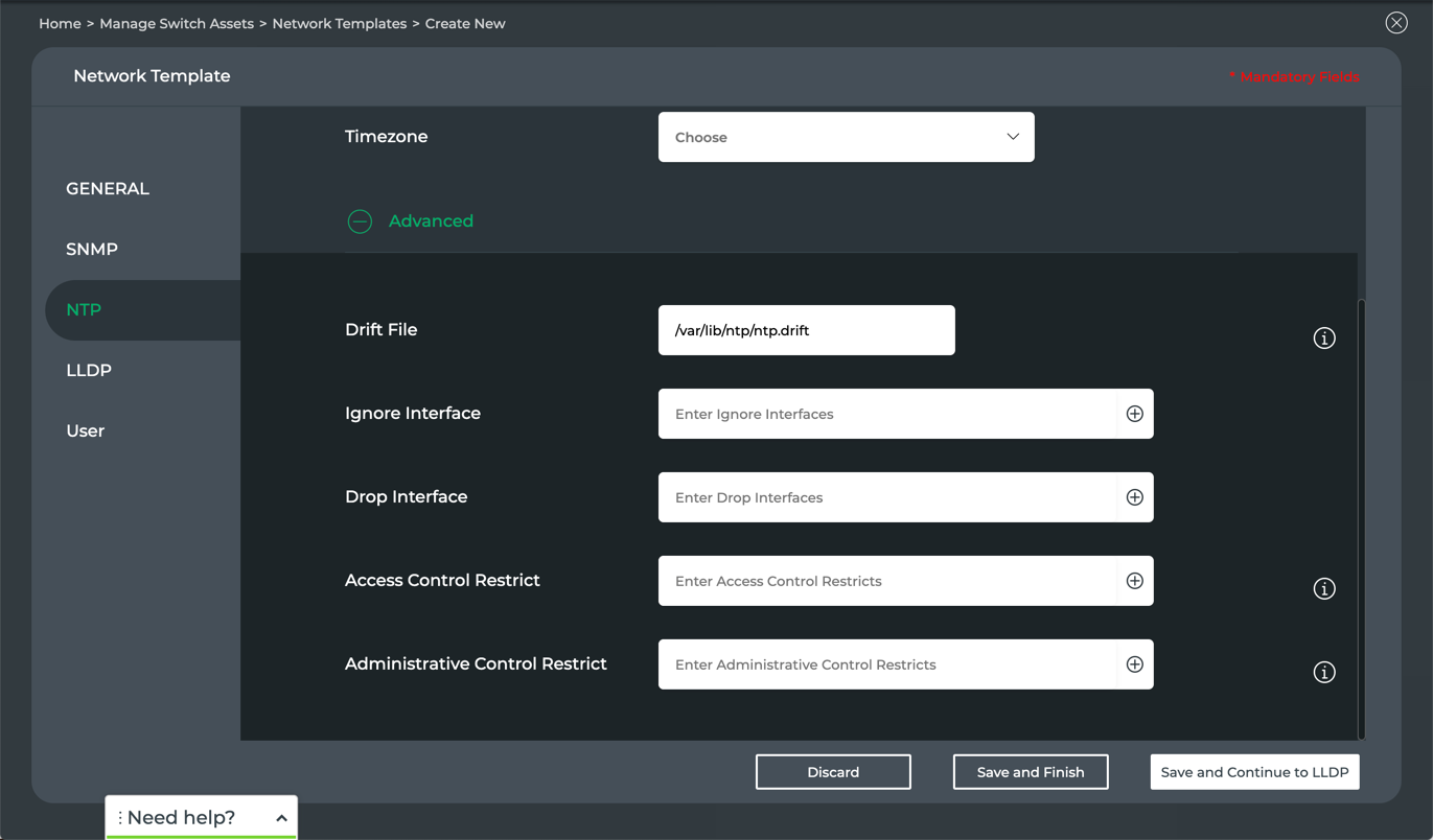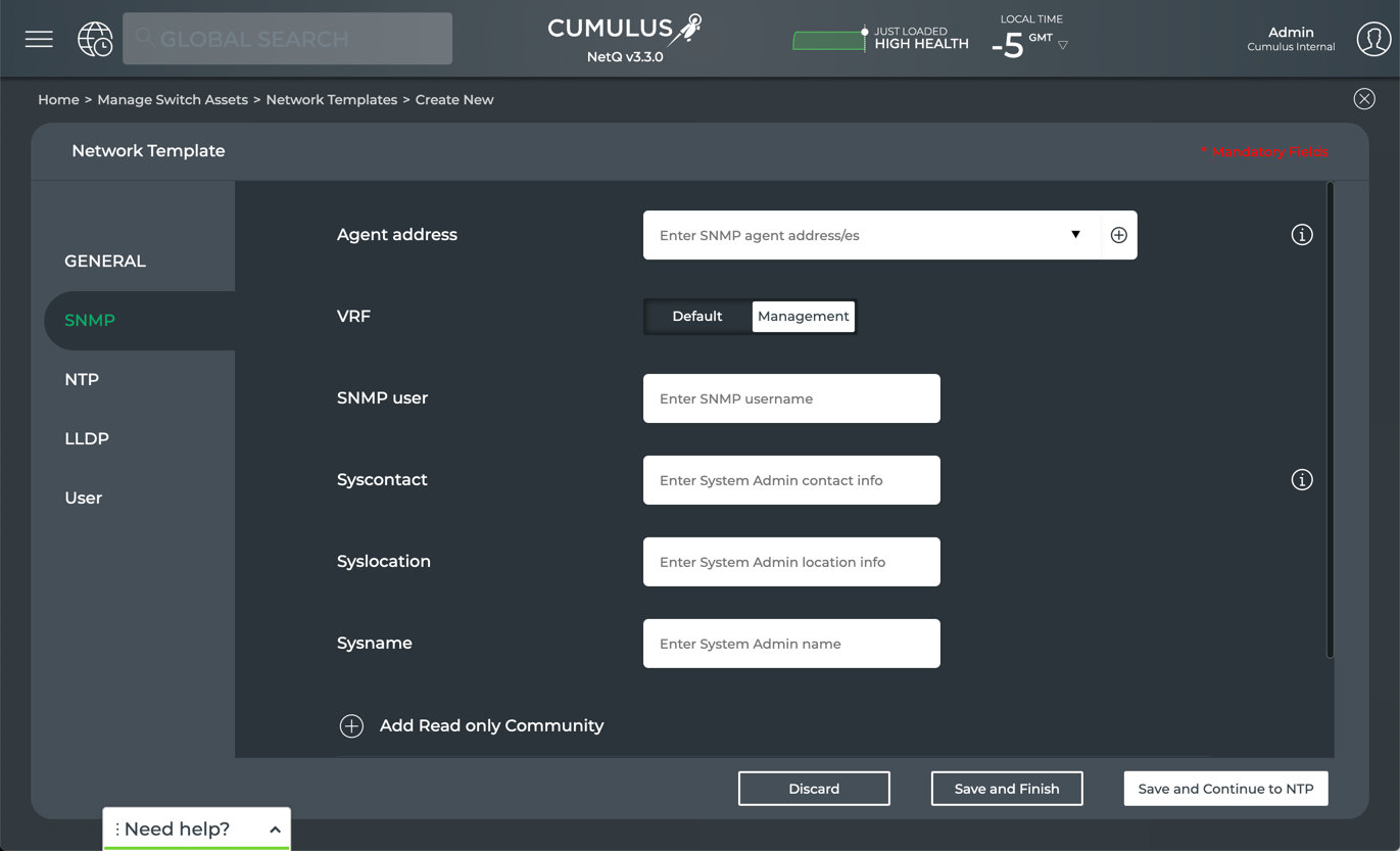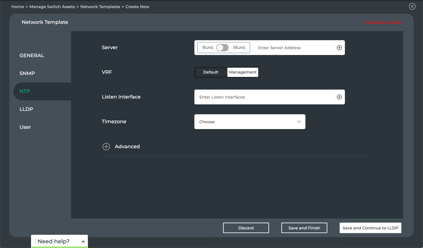 Decide which aspects of configuration you want included in this template: SNMP, NTP, LLDP, and/or User accounts.