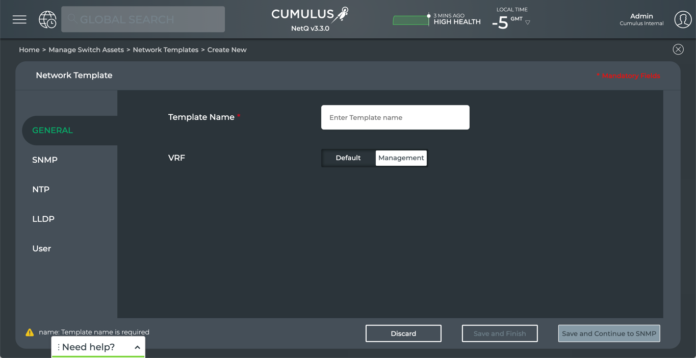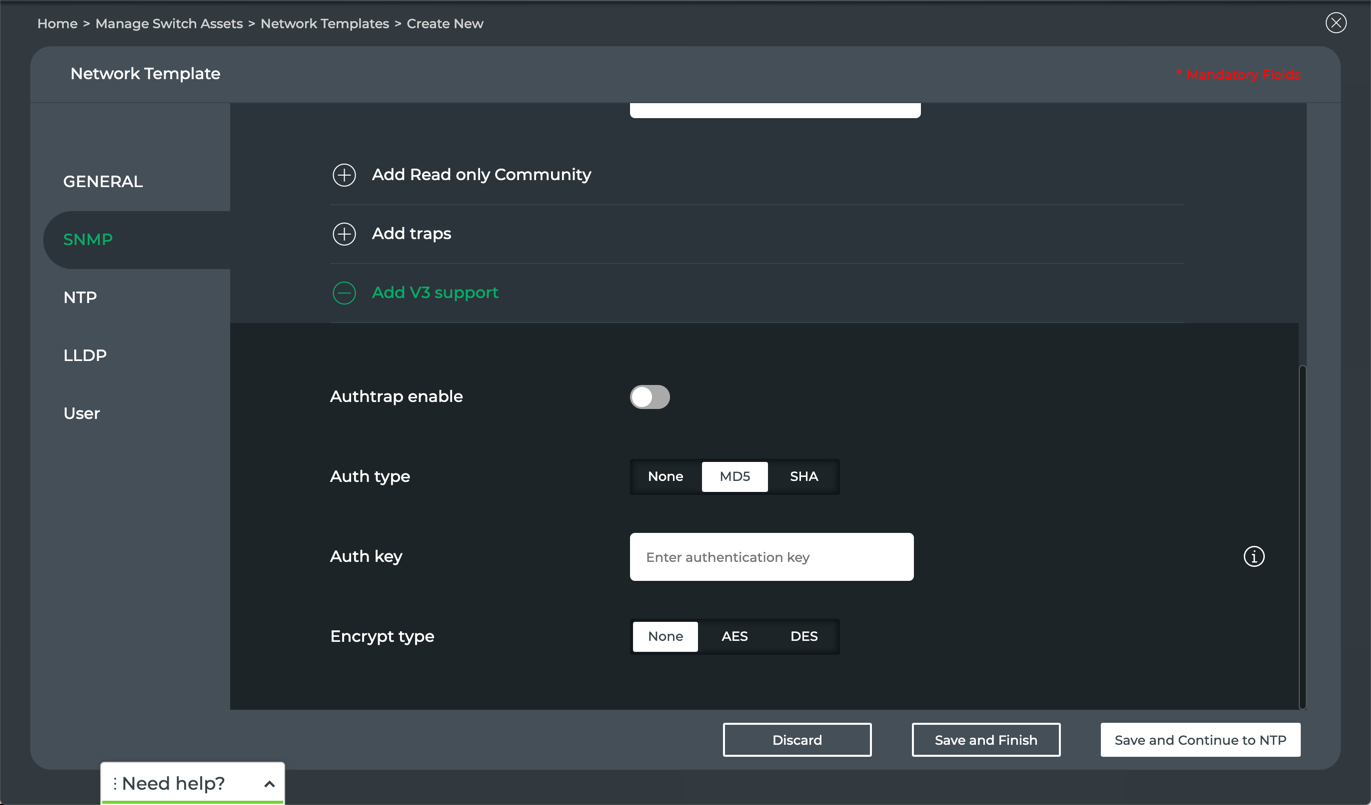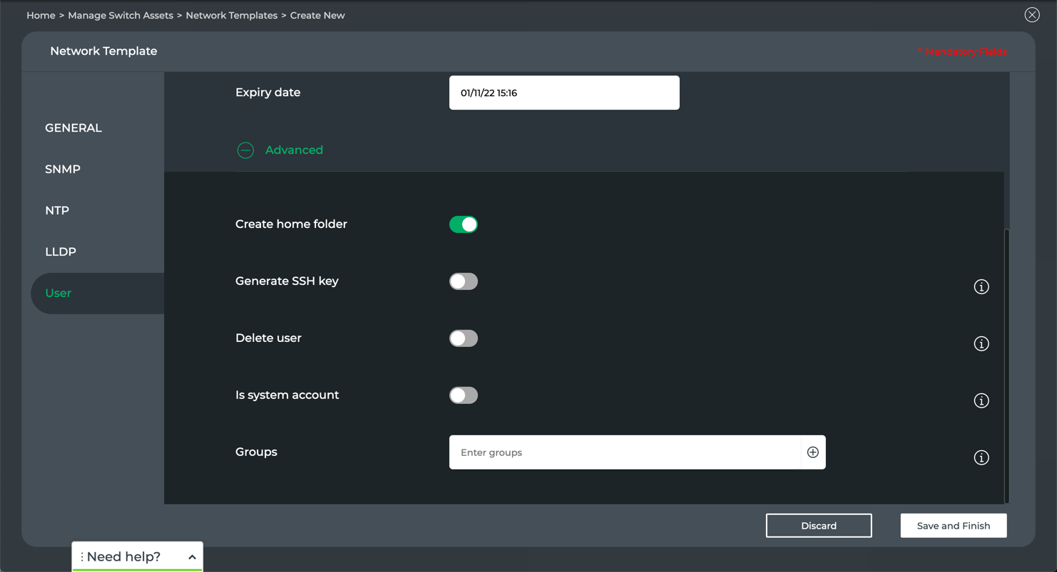 Decide which aspects of configuration you want included in this template: SNMP, NTP, LLDP, and/or User accounts.
