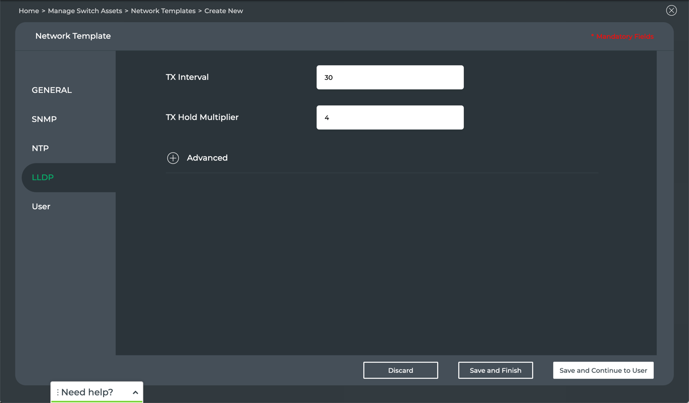 LLDP advertises device identities, capabilities, and neighbors. The network template enables you to specify how often you want the advertisement to take place and how long those messages should remain alive on the network.