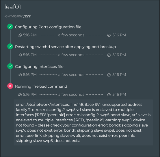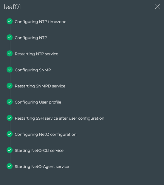 This opens the monitoring page for the assignment jobs, similar to the upgrade jobs. The job title bar indicates the name of the switch configuration being applied and the number of switches that to be assigned with the configuration. (After you have multiple switch configurations created, you might have more than one configuration being applied in a single job.) Each switch element indicates its hostname, IP address, installed Cumulus Linux and NetQ versions, a note indicating this is a new assignment, the switch configuration being applied, and a menu that provides the detailed steps being executed. The last is useful when the assignment fails as any errors are included in this popup.