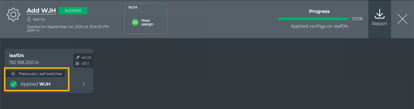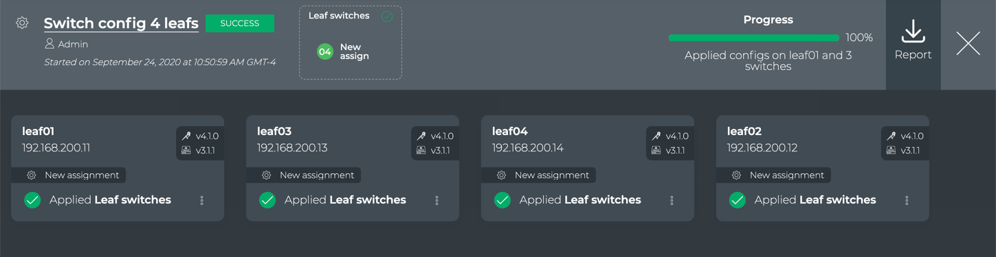 On completion, each switch shows the previous assignment and the newly applied configuration assignment.