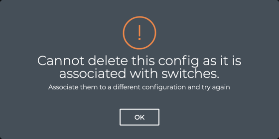 You can remove a switch configuration at any time; however if there are switches with the given configuration assigned, you must first assign an alternate configuration to those switches.