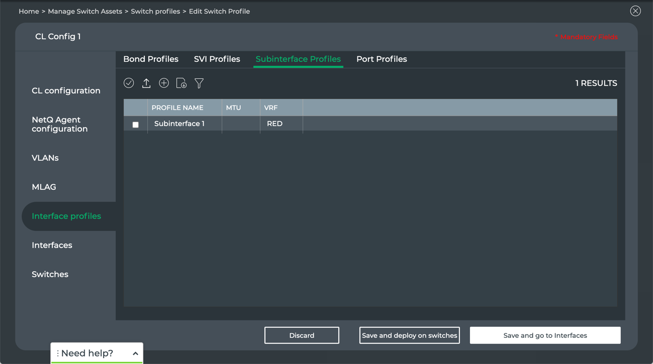 The subinterfaces specified are presented. If no subinterfaces are defined and there should be, return to the Interface Profiles and Interfaces tabs to specify them.