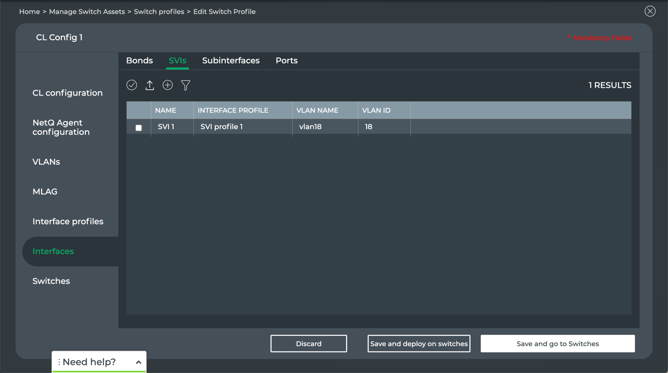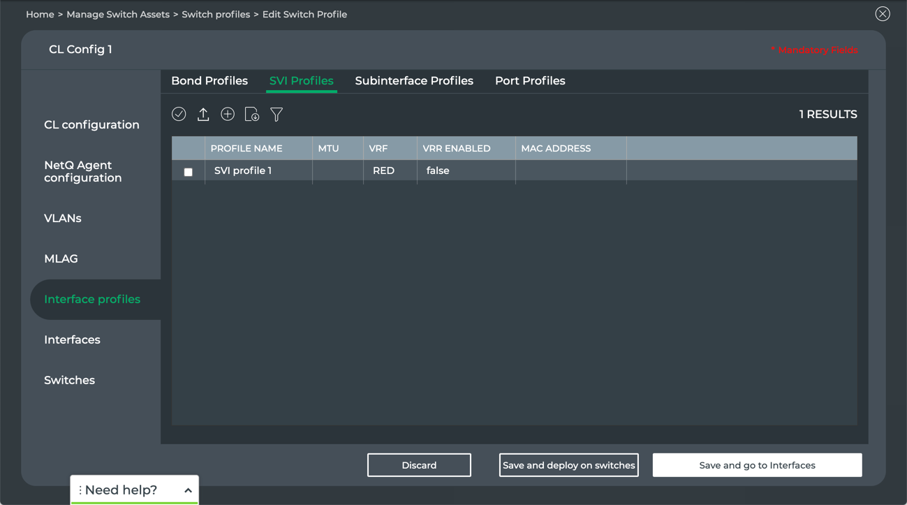 The SVIs specified are presented. If no SVIs are defined and there should be, return to the Interface Profiles and Interfaces tabs to specify them.