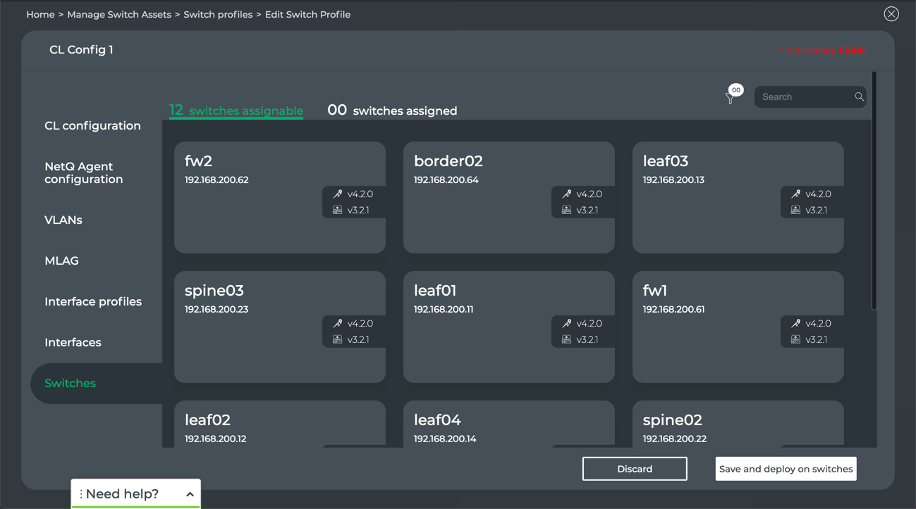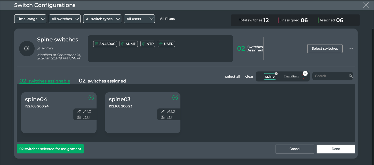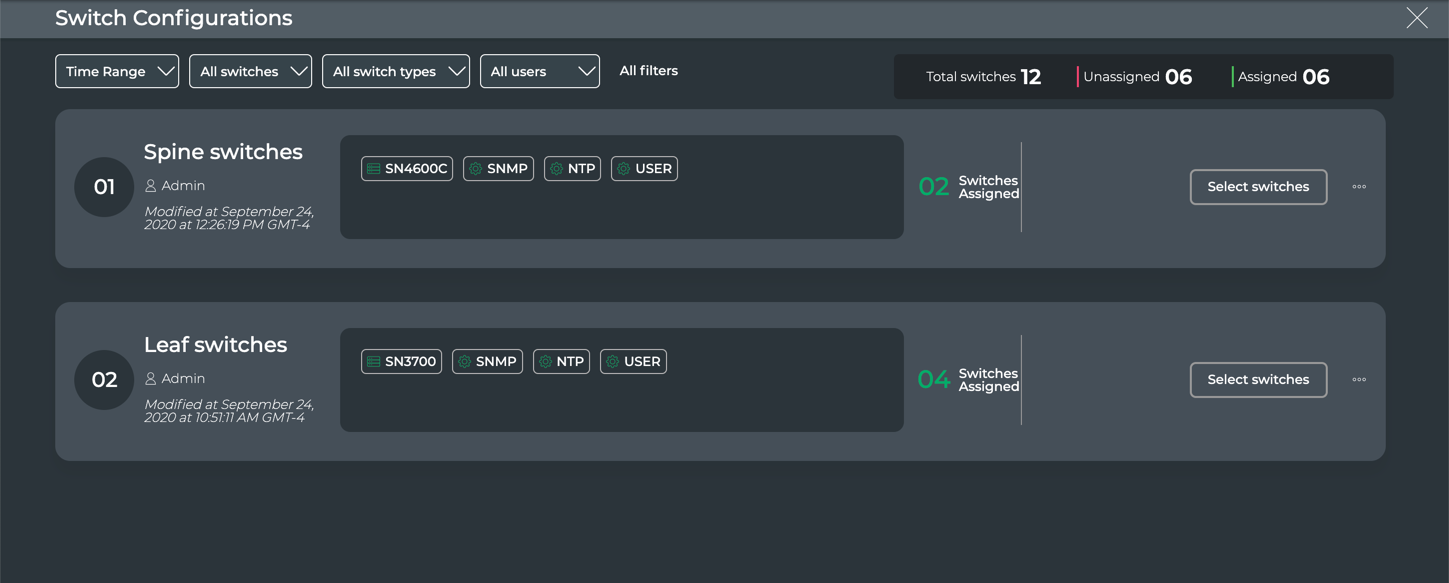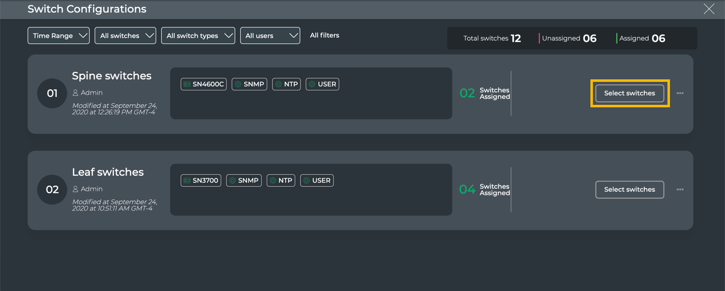 - Above the switches (right), management tools to help find the switches you want to assign with this configuration, including filter and search.
