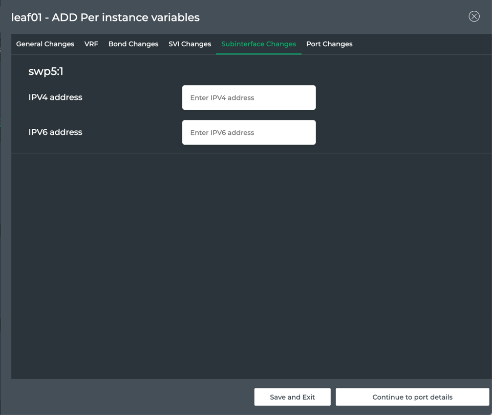 Optionally add the associated IPv4 and IPv6 addresses this switch should use for these subinterfaces.