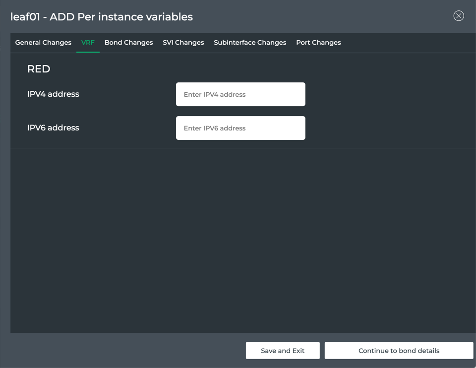 The VRF identified in General Changes is presented. Optionally add the associated IPv4 and IPv6 addresses for this VRF.