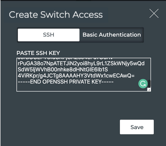 Copy the SSH private key into the entry field in the Create Switch Access card.