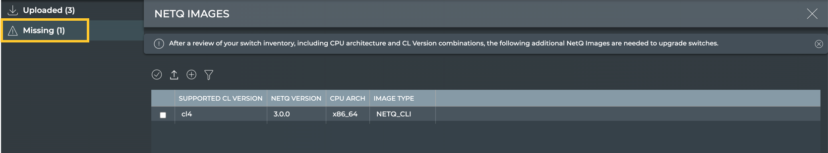 While you do not have to upload images that NetQ determines to be missing, not doing so might cause failures when you attempt to upgrade your switches.