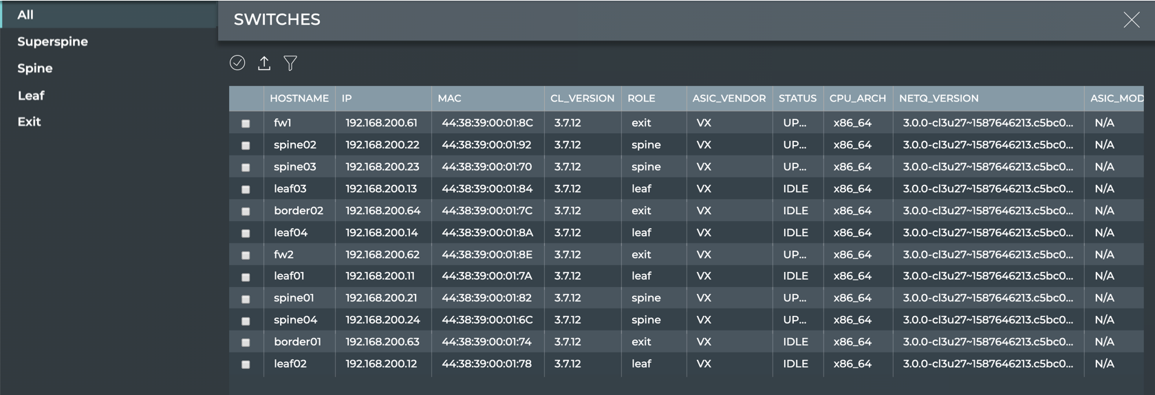 On initial installation, the lifecycle management feature provides an inventory of switches that have been automatically discovered by NetQ and are available for software installation or upgrade through NetQ. This includes all switches running Cumulus Linux 3.7.12 or later, SONiC 202012 or later, and NetQ Agent 4.1.0 or later in your network. You assign network roles to switches and select switches for software installation and upgrade from this inventory listing.