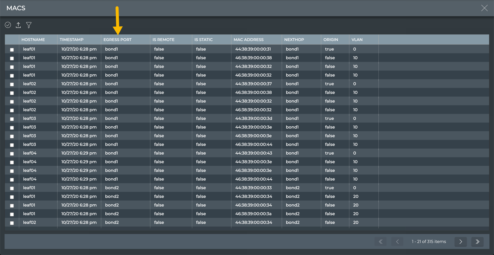 - Origin: MAC address is owned by a particular switch, on one or more interfaces. A MAC address typically has only one origin node. The exceptions are when MLAG is configured, the MAC on the VRR interfaces for the MLAG pair is the same, and when EVPN is configured, the MAC is distributed across the layer 3 gateways.