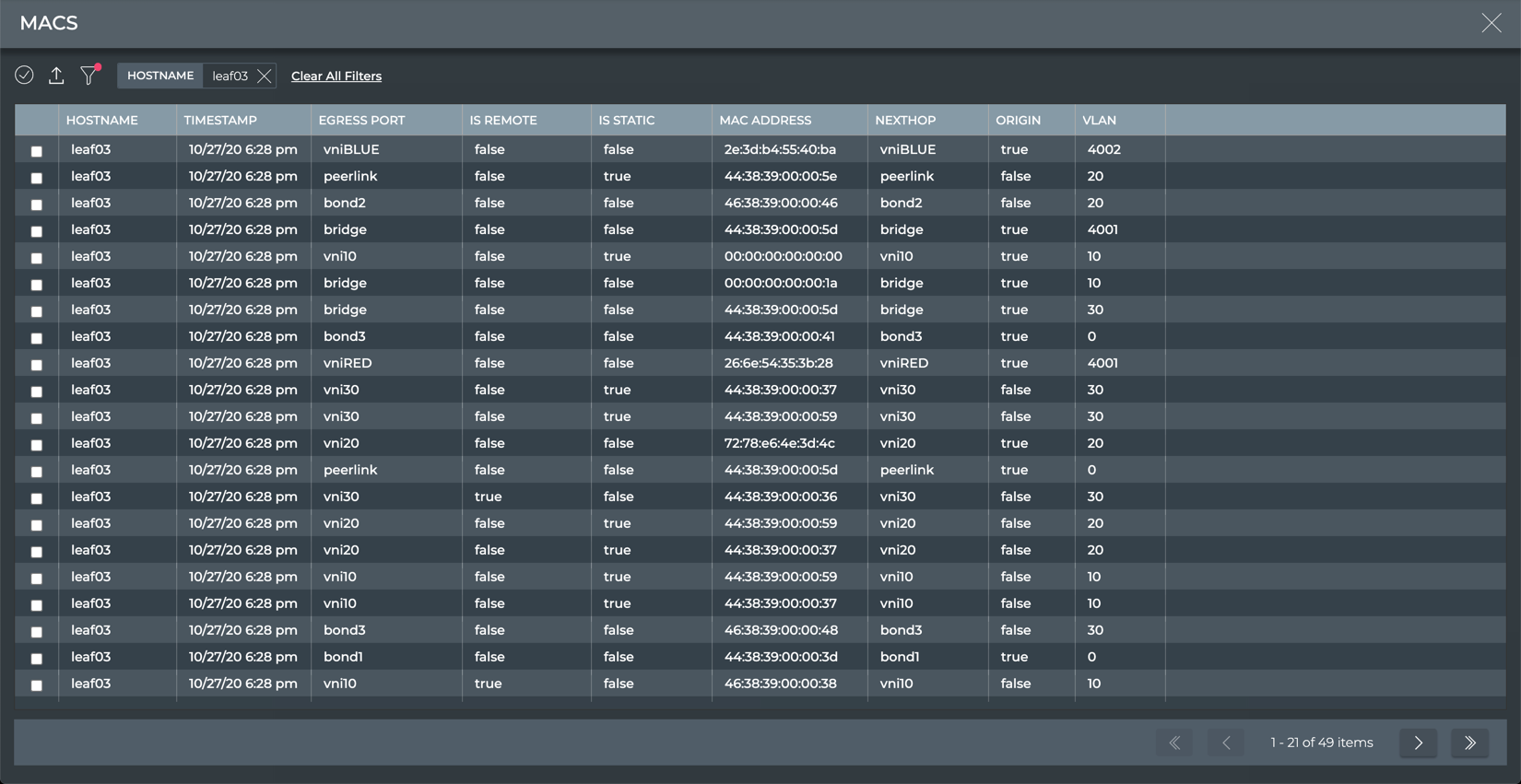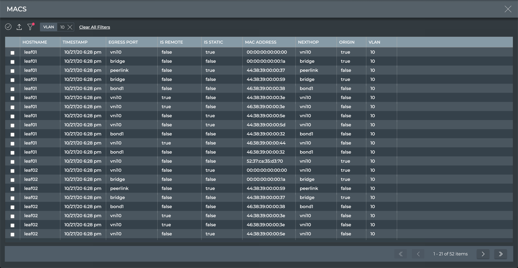 The NetQ UI provides a listing of current MAC addresses that you can filter by hostname, timestamp, MAC address, VLAN, and origin. You can sort the list by these parameters and also remote, static, and next hop.