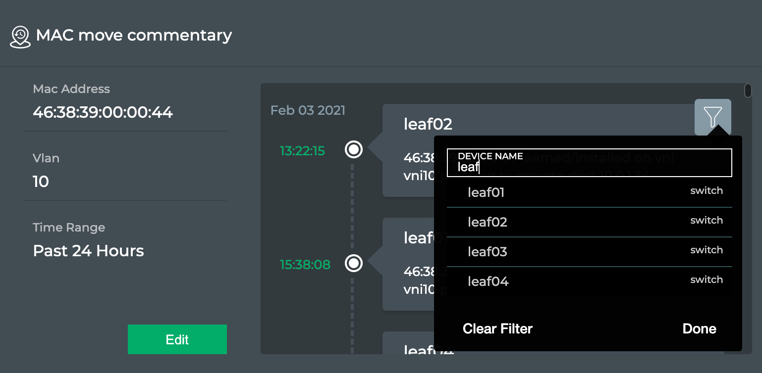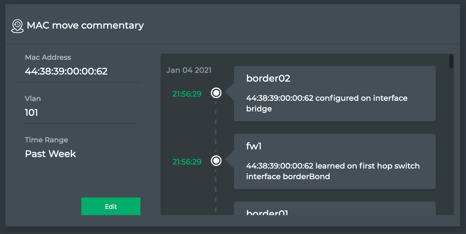 - Scroll through the list on the right to see comments related to the MAC address moves and changes.