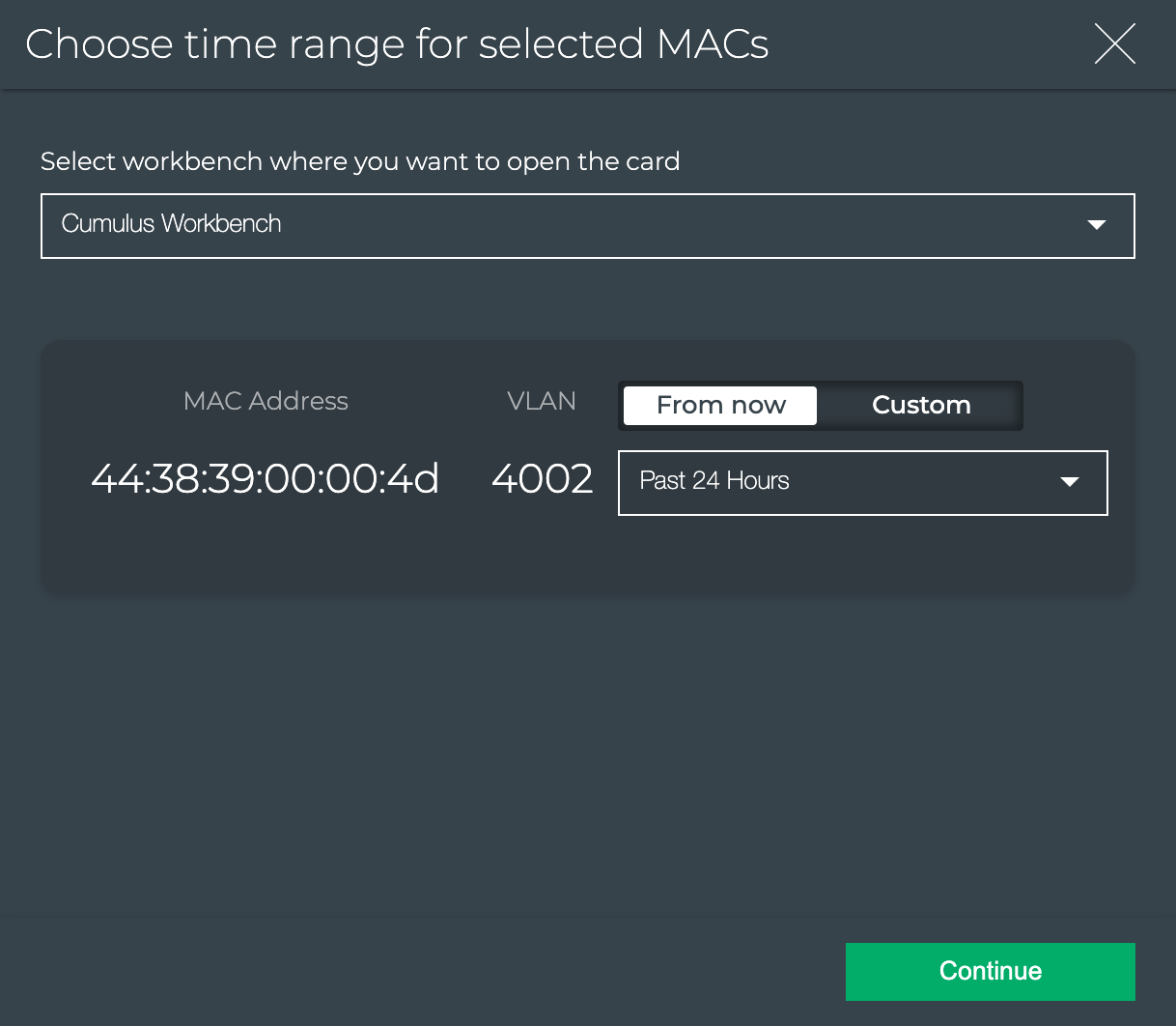You can view all MAC addresses on a given device with the NetQ UI or the NetQ CLI.