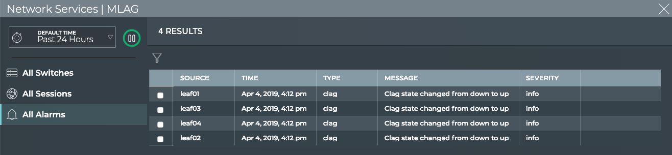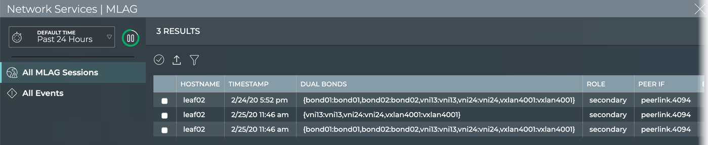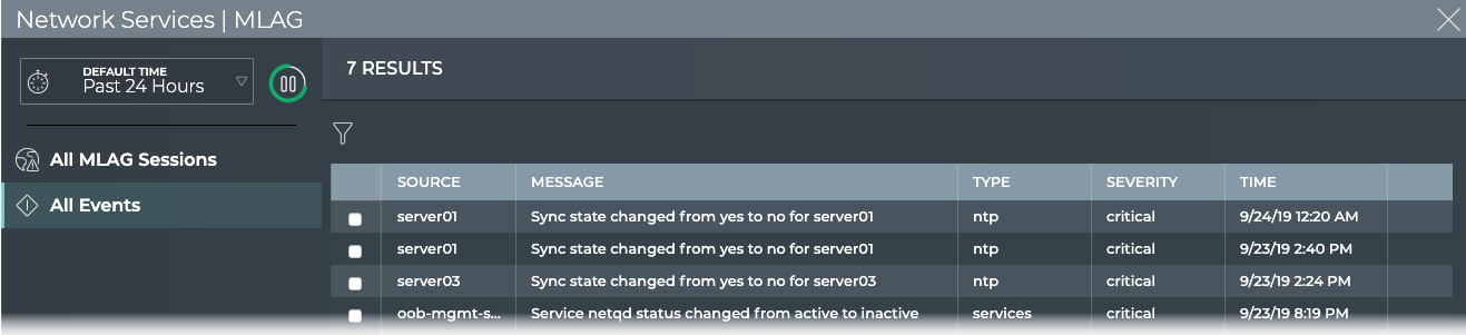 The Network Services|All MLAG Sessions card workflow and the netq show events type mlag command enable you to view all MLAG events in a designated time period.