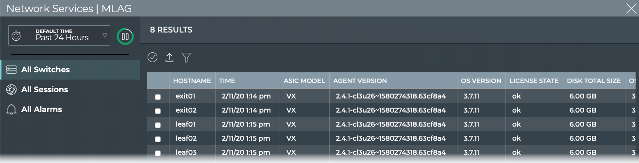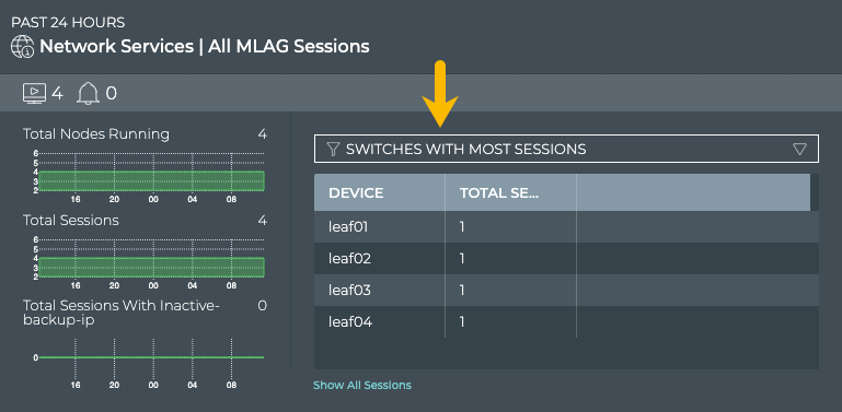 You can view the load from MLAG on your switches using the large Network Services|All MLAG Sessions card. This data enables you to see which switches are handling the most MLAG traffic currently, validate that is what you expect based on your network design, and compare that with data from an earlier time to look for any differences.