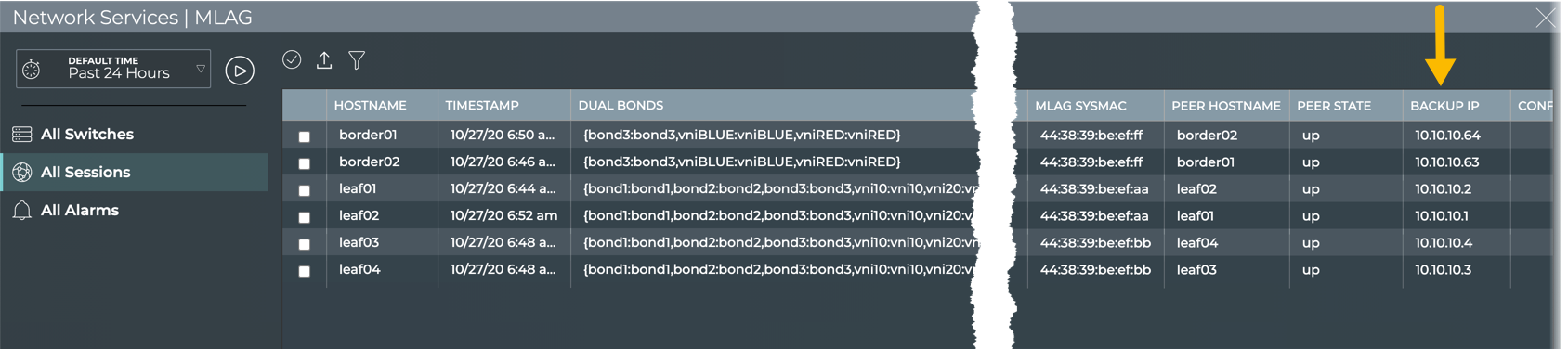 You can determine whether MLAG sessions have a backup IP address assigned and ready using the NetQ UI or NetQ CLI.