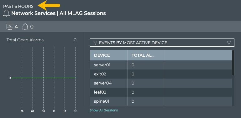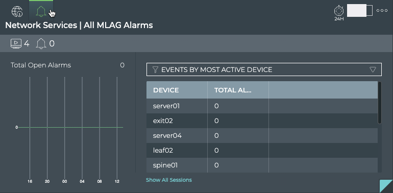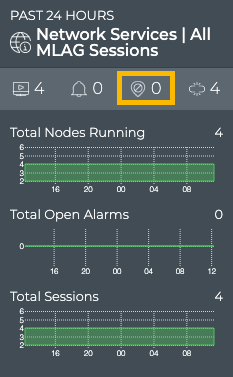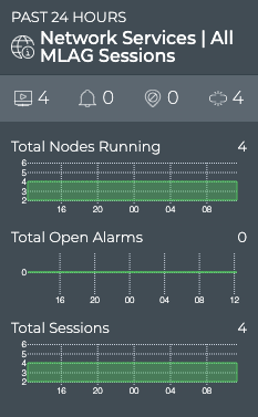 To view the summary, open the small Network Services|All MLAG Sessions card. In this example, the number of devices running the MLAG service is 4 and no alarms are present.