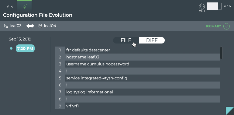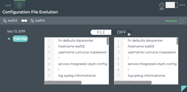 Each time a change is made to the configuration file for the MLAG service, NetQ logs the change and enables you to compare it with the last version using the NetQ UI. This can be useful when you are troubleshooting potential causes for alarms or sessions losing their connections.