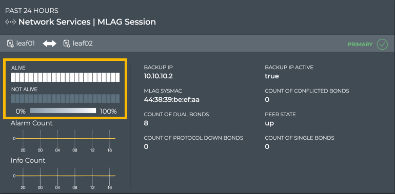 - Medium: view number of nodes running MLAG service, number and distribution of sessions and alarms, number of sessions with inactive backup IPs, and number of bonds with single connections