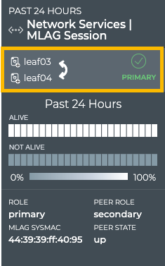 You can view the peering state for a given MLAG session from the medium and large MLAG Session cards. For a given time period, you can determine the stability of the MLAG session between two devices. If you experienced connectivity issues at a particular time, you can use these cards to help verify the state of the peer. If the peer was not alive more than it was alive, you can then investigate further into possible causes.