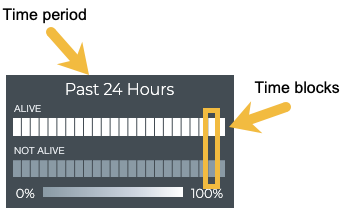 On the medium and large single MLAG session cards, vertically stacked heat maps represent the status of the peers; one for peers that are reachable (alive), and one for peers that are unreachable (not alive). Depending on the time period of data on the card, the number of smaller time blocks used to indicate the status varies. A vertical stack of time blocks, one from each map, includes the results from all checks during that time. The amount of saturation for each block indicates how many peers were alive. If all peers during that time period were alive for the entire time block, then the top block is 100% saturated (white) and the not alive block is zero percent saturated (gray). As peers that are not alive increase in saturation, the amount of saturation diminishes proportionally for peers that are in the alive block. The example below shows a heat map for a time period of 24 hours with the most common time periods in the table showing the resulting time blocks.