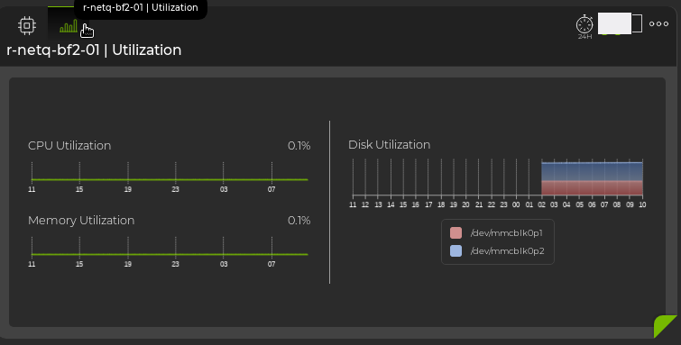 With the NetQ UI, you can monitor hardware resources of individual data processing units (DPUs), including CPU utilization, disk usage, and memory utilization.