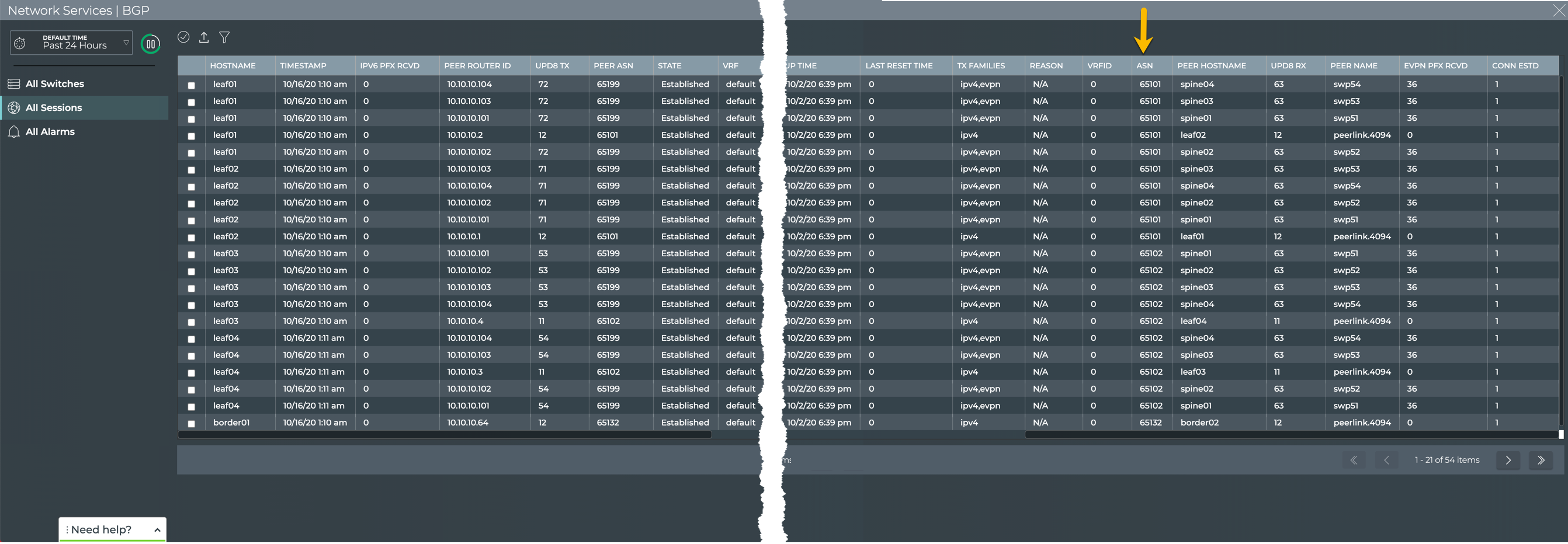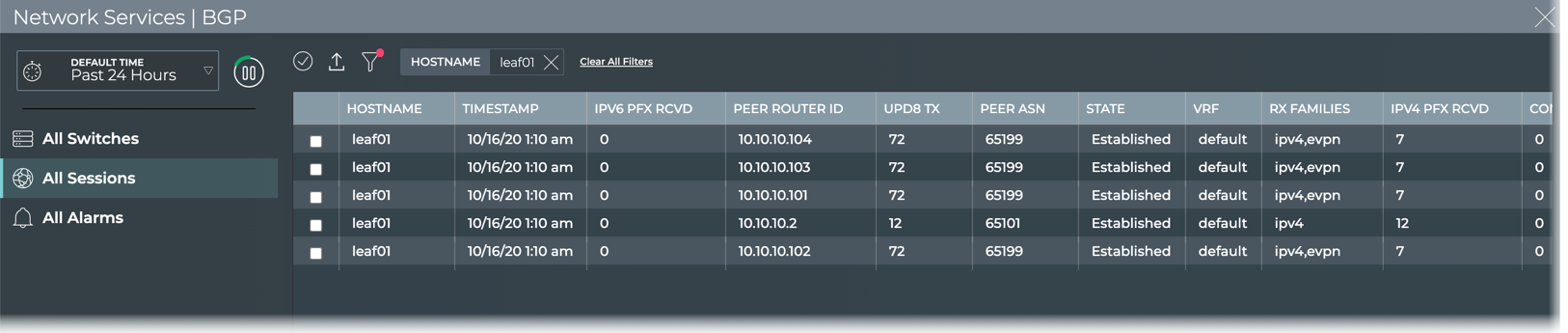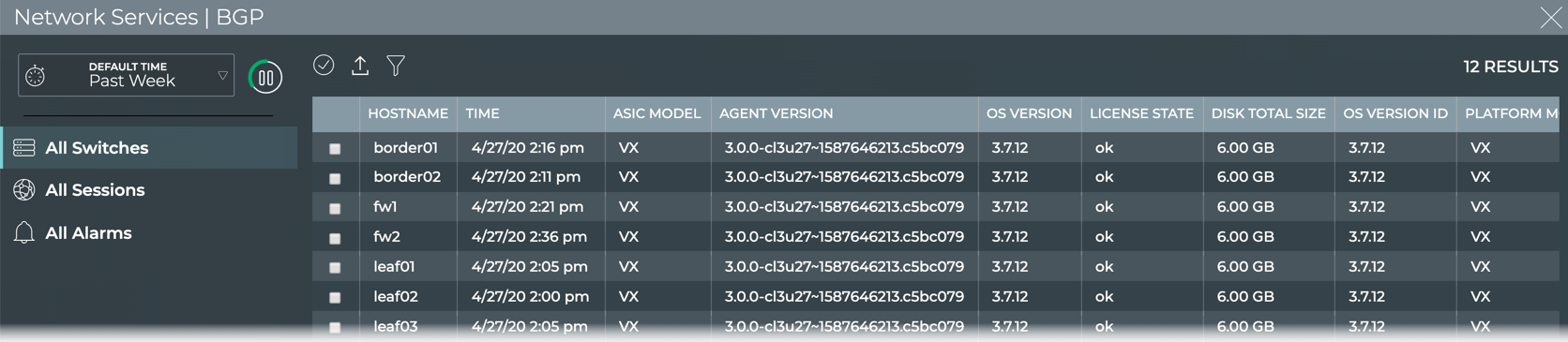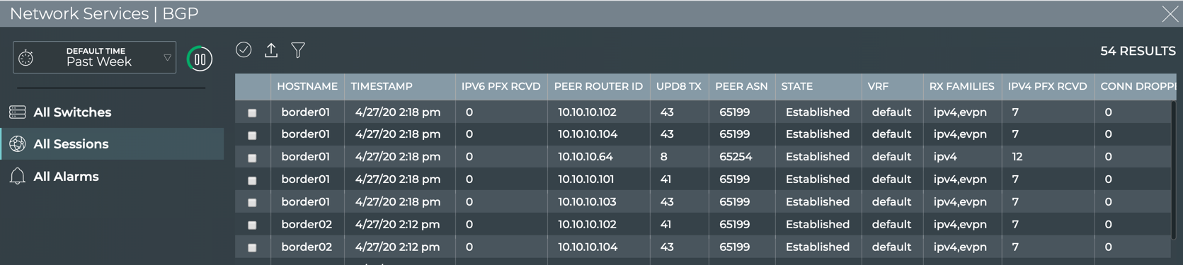 To view all device details, open the full-screen Network Services|All BGP Sessions card and click the All Switches tab.