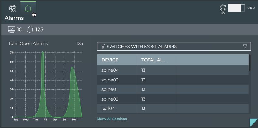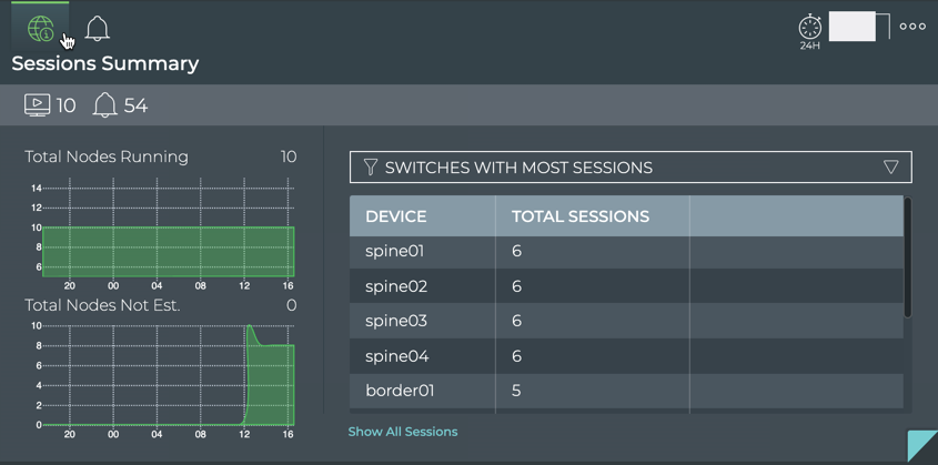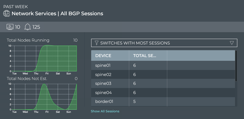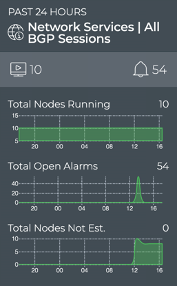 In this example, we see that 10 nodes are running the BGP protocol, there are no nodes with unestablished sessions, and that 54 LLDP-related alarms have occurred in the last 24 hours. If a visual correlation between the alarms and unestablished sessions is apparent, you can dig a little deeper with the large Network Services|All BGP Sessions card.