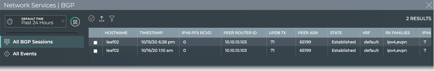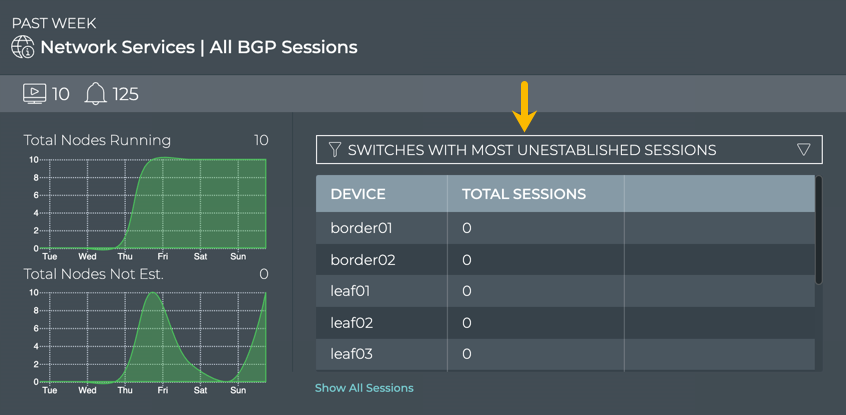 To view all session details, open the full-screen Network Services|All BGP Sessions card and click the All Sessions tab.
