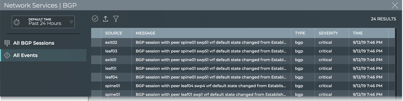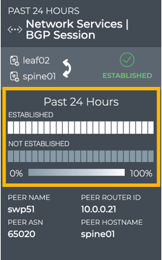 You can view the state of a given BGP session from the medium and large Network Service|All BGP Sessions card in the NetQ UI. For a given time period, you can determine the stability of the BGP session between two devices. If you experienced connectivity issues at a particular time, you can use these cards to help verify the state of the session. If the session is unestablished more than it was established, you can then investigate further into possible causes.